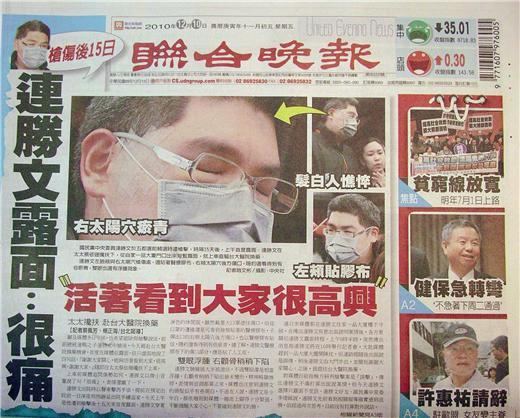 顧及媒體多日守候,也希望破除假槍擊說法,前副總統連戰之子連勝文中槍後,今天藉赴台大醫院換藥機會,首度在媒體前露面,但只虛弱地說了四句話:「謝謝大家關心,能夠活著看到大家,很高興,謝謝大家。」隨即在太太蔡依珊攙扶下上車。