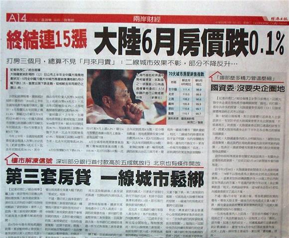 雖然大陸官方打房政策一波波,然而六月分七十個大中城市新建住宅價格,仍比去年同期上漲了一四.一%。不過六月的房價,則要比五月下降了○.一%,顯示在官方連續抑制房產業的措施下,大陸房市已出現疲軟跡象,過去只漲不跌的走勢將做修正。