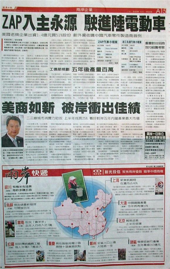 美國老牌電動車企業ZAP出資4,300萬美元(約新台幣1.4億元)收購浙江永源汽車51%的股份,企圖進軍中國電動車市場,這也是第一起外資收購中國整車企業(台灣稱汽車零件製造商)的案例。