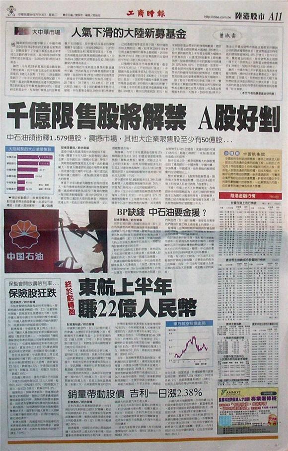 當前中國大陸滬深股市表現疲弱不堪,不過,隨著下半年大陸一批限售期已滿的企業,在中國石油(簡稱中石油)帶領下,其限售股解禁後將流入市場,由於數額龐大,投資人擔憂將給A股市場帶來衝擊。而流通市值大增的中石油,更可望因此打敗中國工商銀行,成為A股流通市值最大的股票。