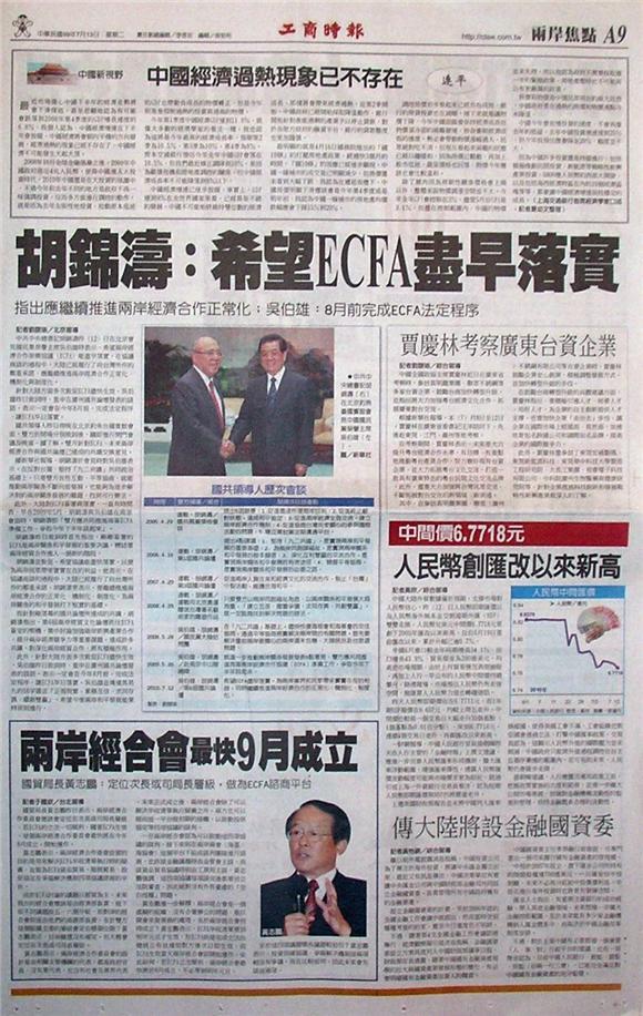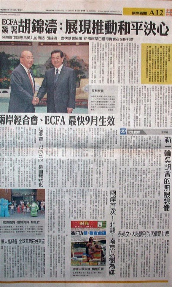 中共中央總書記胡錦濤昨(12)日在北京會見國民黨榮譽主席吳伯雄時表示,希望兩岸經濟合作架構協議(ECFA)能盡早落實,在協議商談的過程中,大陸已經履行了向台灣所作的鄭重承諾,應繼續推進兩岸經濟合作正常化、機制化與制度化。