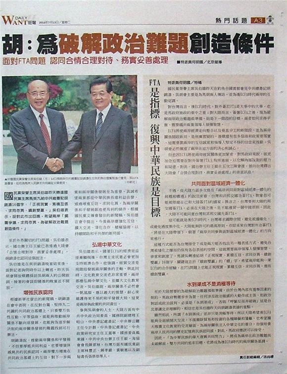 國民黨榮譽主席吳伯雄昨天轉達國民黨主席馬英九給中共總書記胡錦濤16個字:「正視現實、累積互信、求同存異、續創雙贏。」吳伯雄表示,胡對此作出回應,希望兩岸「擱置爭議,求同存異,為破解政治難題創造條件。」