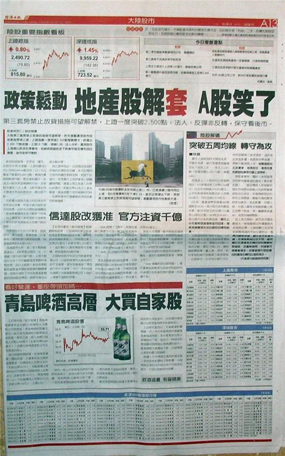大陸第三套房禁止放貸的措施可望解禁,昨天激勵滬深股市由地產股帶領上漲,上證指數一度突破2,500點整數關卡,終場以2,490.72點收盤,上漲19.79點,漲幅0.8%。法人分析,滬深股市上漲應以跌深反彈看待,短線將面臨前波下跌套牢區及獲利回吐賣壓,後市宜保守應對。