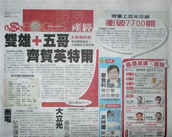 全球最大半導體公司英特爾 (Intel)第二季財報告捷,不但轉虧為盈,更創下單季歷史新高,並上修財測及資本支出,使得該公司盤後大漲7%,今激勵國內的英特爾概念股,以及半導體股全面勁揚,包括晶圓雙雄台積電 (2330)、聯電,電子五哥的 (2303)鴻海 (2317)、華碩 (2357)、宏碁(2353) 、仁寶(2324)、廣達(2382)等齊步慶賀。
