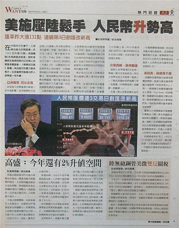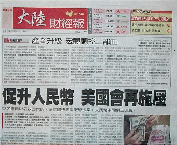 路透報導,93名美國國會議員已聯名致函眾院民主黨領袖,要求儘快表決嚴懲中國壓抑人民幣匯價的法案。隨著人民幣升值壓力升高,人民幣兌美元中間價昨(14)日再次上揚131個基點,為連續第三個交易日創出2005年7月匯率改格以來的新高。