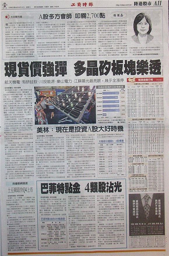 價格落底的多晶矽(中國大陸稱多晶硅),近期展開絕地大反攻,價格飆漲,已成為當前中國股市繼太陽能、稀土等概念之後,又一個強勢題材。昨(14)日拜多晶矽價格上揚所賜,中國A股相關的新能源概念股樂透,多檔個股受此帶動漲停。