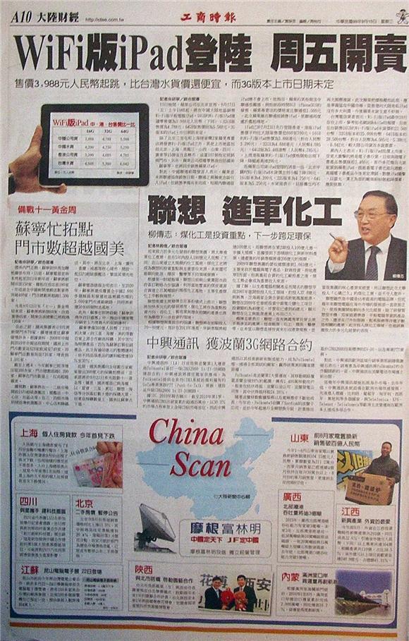 13日晚間,蘋果公司在北京宣佈,9月17日(五)上午10時起,將在中國大陸地區銷售Wi-Fi版平板電腦iPad。16GB的Wi-Fi版iPad建議零售價為3,988元人民幣(下同);32GB版售價為4,788元;64GB版售價則為5,588元。3G版本的iPad上市日期則未定。