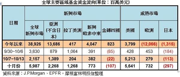 統計三大新興區域中,以亞洲(不含日本)的吸金力道最強,自9月以來已連續吸金達6週之久,上週淨流入13.89億美元,亦居新興區域之冠,在資金行情與經濟復甦加持下,亞洲(不含日本)持續成為資金匯聚焦點。