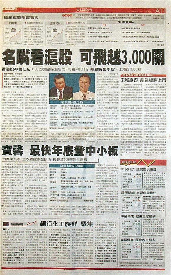 滬市上證指數「十一」節後天天上漲,上周兵臨3,000點關前,漲幅多達11.9%。香港股神曹仁超指出,上證指數在3,200點附近將遭逢阻力,炒短線者可獲利了結;華夏時報總編輯水皮說,上證指數回到3,000點之上是正常的,3,500點才是A股價值中樞。中國證券報報導,上證指數在「十一」長假後連續攻克2,700點、2,800點及2,900點整數關卡。香港投資評論家曹仁超提醒,根據量度升幅,上證短期阻力在3,200點附近,先前在2,319點進場的投資人短線者可在3,200點左右先落袋為安。
