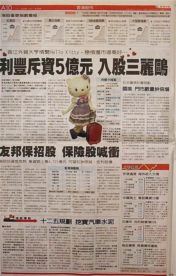 香港消費品外貿商利豐集團情繫日本知名的卡通貓Hello Kitty,傳出斥資港幣1.248億元(約新台幣5.11億元)入股Hello Kitty的品牌商三麗鷗Sanrio約1%權益,利豐與三麗鷗方面均證實該消息。