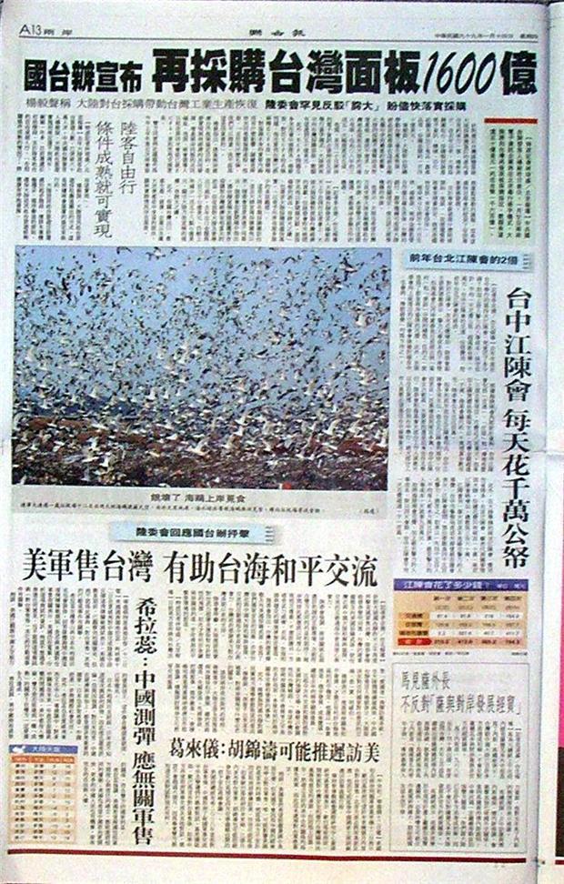 中共國台辦發言人楊毅昨日表示,一月廿日兩岸電子資訊企業將在北京舉行簽字儀式,大陸將向台灣再簽面板採購協定,數額有望達五十億美元(約近台幣一千六百億)。