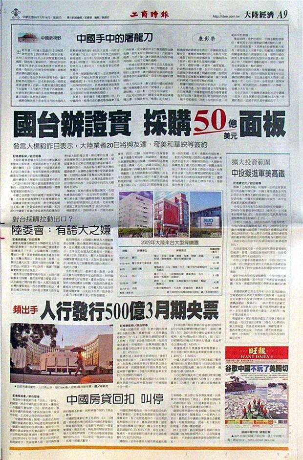 大陸彩電業者繼去年5月向台灣採購30多億美元面板後,近期將再對台下大訂單。國台辦昨(13)日證實,大陸業者將於本月20日與友達、奇美和華映等台灣面板廠簽定50億美元的面板採購協議。