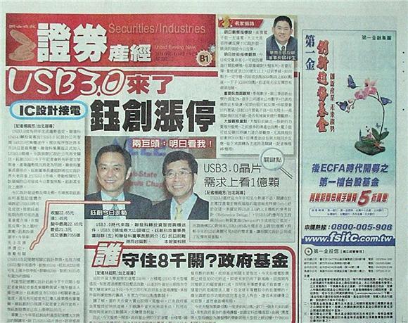 USB3.0成為明年主流趨勢抵定,聯發科(2454)轉投資專攻USB3.0 IC設計公司智微 (4925)已興櫃送件,推估程序預計將本月28日登錄興櫃,聯發科集團股正式加入USB3.0戰場,令該族群IC設計公司再受關注,鈺創(5351)今下午記者會將有研發主管與會,產業趨勢現況將更為明朗,聯發科董事長蔡明介、鈺創董事長盧超群兩位IC設計界大老同看上USB3.0市場,帶動相關切入該領堿的公司皆成今日買盤焦點,鈺創甚至攻上漲停。