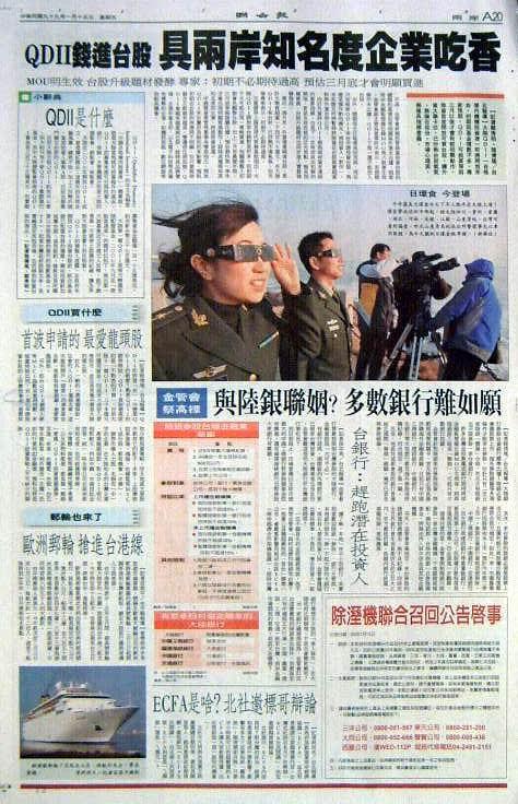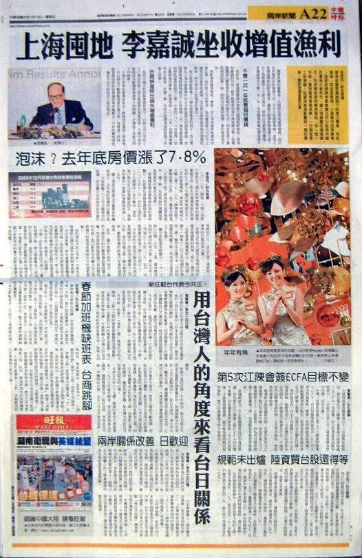 台灣主要報紙大陸版要聞標題一覽 (1月15日)
