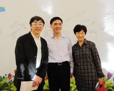 伊東豐雄建築師、與伊東豐雄事務所主持人泉洋子與市長郝龍斌於花博大廳牆上簽名合照