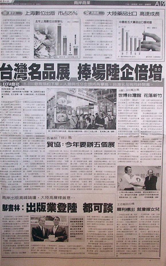 ECFA實施後,海峽兩岸最大的展覽「第二屆南京台灣名品交易會」及大陸第一個「台灣名品城」昨天同時開幕。外貿協會董事長王志剛表示,第一屆南京台灣名品展吸引26.7萬人進場參觀,成交金額約7.6億美元(約新台幣241.11億元)。第二屆名品展的規模更大,預估參觀人潮和成交金額可望再創新高。
