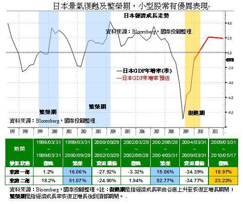 由於日本景氣去年落底,目前仍屬於復甦期正要進入繁榮期的階段,未來隨著全球景氣復甦持續,日本內需也可逐步恢復生氣。雖然日本經濟長遠發展仍有國債偏高及通縮等不利因素,但在目前的景氣復甦循環上,日本小型股將有持續表現的空間,建議投資人擇時佈局,掌握投資機會。