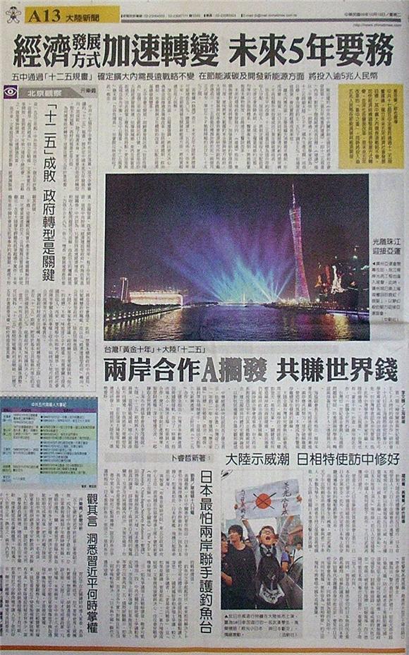 台灣主要報紙大陸版要聞標題一覽 (10月19日)