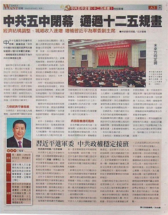 中共十七屆五中全會昨天閉幕,審議通過「中共中央關於制定國民經濟和社會發展第12個5年規畫的建議」,增補國家副主席習近平為中共中央軍委副主席。