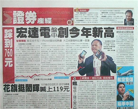 宏達電(2498)股王再發威,今早盤中一度觸及760元高價,再創今年來新高紀錄,大漲逾3%,帶動高價股如大立光(3008)、聯發科(2454)比價上揚,均有近2%漲幅。宏達電在英國發表HTC新機後,獲外商高盛證券給予上千元目標價令市場咋舌,蘋果iPhone4手機今凌晨開賣,大批民眾排隊搶鮮,預購20萬人年底前缺貨底定,令市場預期消費電子旺季銷售實績將有助股價再提升。