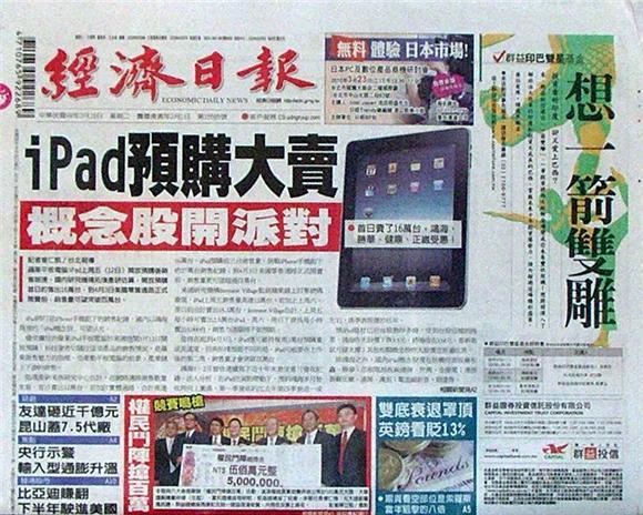 ◆經濟日報:iPad預購大賣 概念股開派對