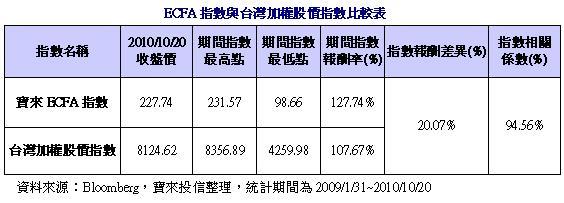 ECFA(兩岸經濟合作協議)於9月12日生效,受惠於ECFA之企業未來成長爆發力不可限量,「寶來ECFA指數」自指數編製基期以來(2009/1/31~2010/10/20),於ECFA生效一個月後超越台灣加權股價指數報酬達20%。