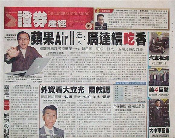 蘋果(APPLE)推出Macbook Air新二代產品,共推二款尺寸,由於價位在美金999~1399元之間,也就是新台幣3萬元至4萬5千元就能擁有蘋果超輕薄的筆電產品,市場法人指出,第二代的Macbook Air還是由廣達(2382)代工,相關供應鏈也多延襲第一代,軸承由新日興(3376)、機殼由可成(2474)、面板及Flash由韓商三星(Samsung)、新增的百萬畫素光學鏡頭則有可能是亞光(3019)和玉晶光(3406)供應。