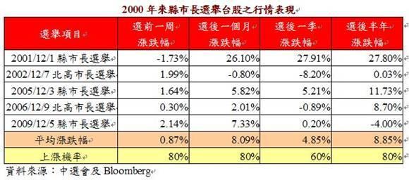 根據統計,就縣市長選前一週來看,台股平均漲幅為0.87%,上漲機率高達8成;就選後一個月來看,台股平均漲幅為8.09%,上漲機率高達8成;就選後一季來看,台股平均漲幅為4.85%,上漲機率為6成;就選後半年來看,台股平均漲幅為8.85%,上漲機率高達8成。