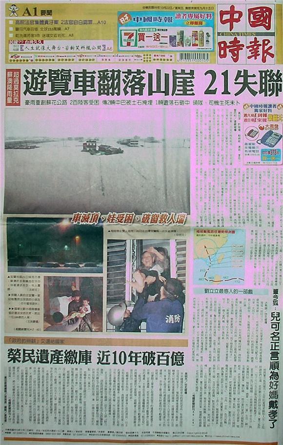 ◆自由時報:梅姬灌雨 蘇花坍方 1車21人疑墜崖