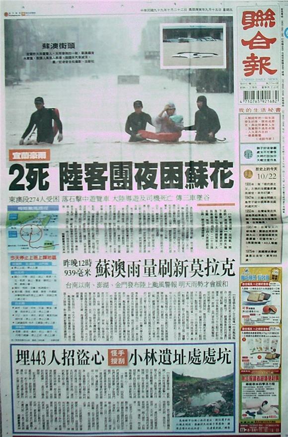 挾帶著驚人雨量的梅姬颱風,昨日重創宜蘭及台灣東北角,尤其宜蘭蘇澳單日雨量近千毫米,寫下氣象局平面測站歷史紀錄,超過莫拉克,鄰近鄉鎮也都衝過六百毫米。詭譎秋颱不僅導致豪雨成災,也迫使兩百多名陸客受困蘇花公路,傳出遊覽車遭落石砸中或翻落山崖意外,至少二傷、廿一失聯、二生死未卜。