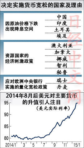 世界各國的中央銀行接連採取了貨幣寬鬆的舉措。受原油價格下跌的影響,應對經濟減速及低通貨膨脹迫在眉睫,加之歐洲中央銀行(ECB)決定實施量化寬鬆,各國貨幣在兌歐元時面臨升值壓力。自2014年秋季以后,超過20個國家的央行實施了降息,而加息已被納入視線的美元則獨自走高。美國企業迎來了考驗持久力的局面。
