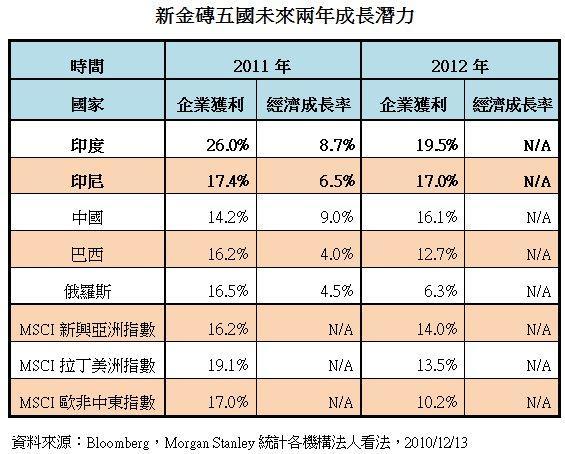 在金融海嘯後,印尼股市率先於2010年創歷史新高,讓國際市場刮目相看,甚至被摩根士丹利(Morgan Stanley)證券選為第5塊金磚,截至12/20的漲幅達40.8%,在全球主要股市中名列前茅。黃媺芸指出,印尼這塊小金磚讓原本的金磚4國不再專美於前,明、後兩年都有17%的企業獲利成長率,股價續漲空間可期。