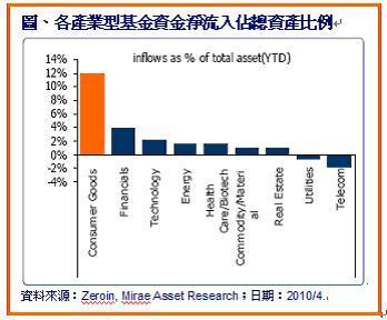 近期全球循環性消費類股表現突出,且從資金流向看來,消費類股已成全球投資人新寵。分析2010年第一季各產業型基金資金淨流入佔總資產比例,消費產業資金流入比例高居各產業型基金榜首(如圖)。