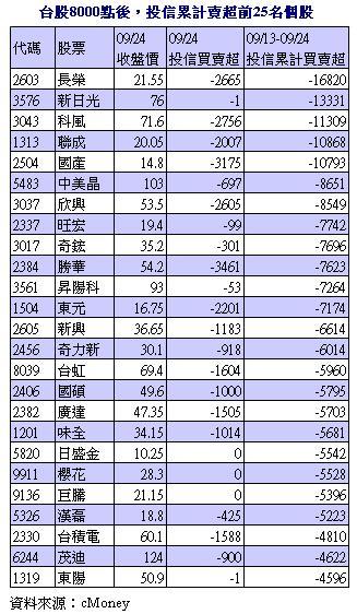 投信從 9 月13日台股躍過8000點後,「山頂上玩、有誰能贏?」的風險意識增高,因此開始一步步倒貨,投信認養標的最多的太陽能股如:新日光、科風、中美晶等,以及ECFA題材的傳產股如:長榮、聯成、國產等,都遭投信法人砍殺萬張。