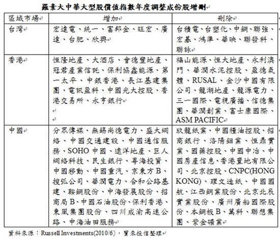 全球市場衡量大中華地區指數的權威標竿--「羅素大中華大型股價值指數」年度成份股調整最新結果出爐!共計新增43檔、刪除44檔成份股,總檔數達到147檔;其中中國、香港投資比例提高,台灣比重明顯調降,年度調整結果將於6/25日收盤後正式生效。寶來投信總經理劉宗聖表示,最新發佈的大中華指數年度調整已更貼近基本面,反映出價值型股票的投資屬性,在指數最新樣貌出爐後,更能表彰大中華經濟圈的投資範疇及投資水平。