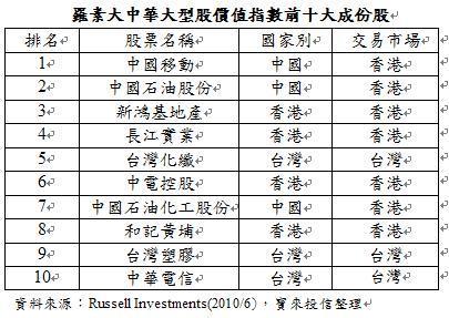 由羅素投資公司所編製的「羅素大中華大型股價值指數」,濃具兩岸三地市場代表性、市場接受度與可交易性,是目前大中華市場中,唯一且客觀的重量級指數,市場採用率已不斷提高,而2009年由寶來投信發行的「寶來大中華價值指數基金」,自基金成立以來,追蹤指數的偏離度情況良好,基金波動亦相對穩健。