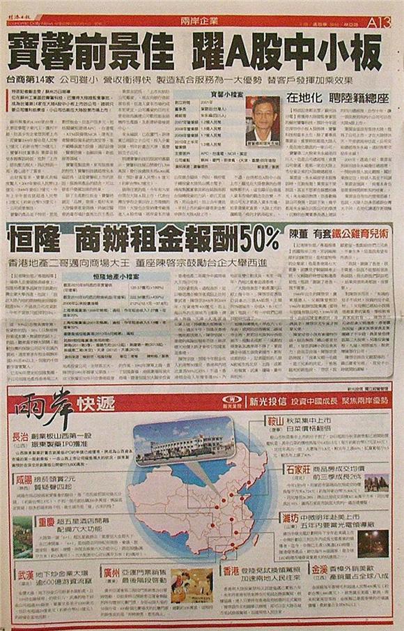 位在蘇州工業區的寶馨科技,已獲得大陸證監會審批,成為台灣第14家在大陸A股中小板上市的公司。證明只要公司獲利前景佳,小公司也能在大陸股票市場上市!