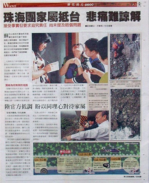 蘇花公路坍方事故昨天陸續在崩坍石礫下挖到、海面上撈到遺骸,皆已殘缺不全,最遠的屍塊已在太平洋漂到北方20公里處;珠海團創意旅行社19名失蹤陸客的家屬昨晚抵台,他們除了接受事實,也要求追究責任。