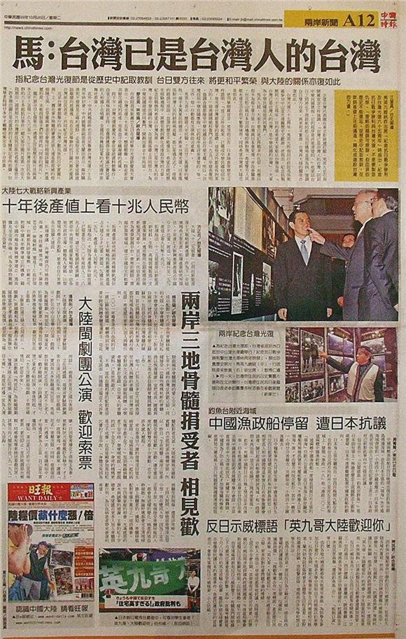台灣主要報紙大陸版要聞標題一覽 (10月26日)