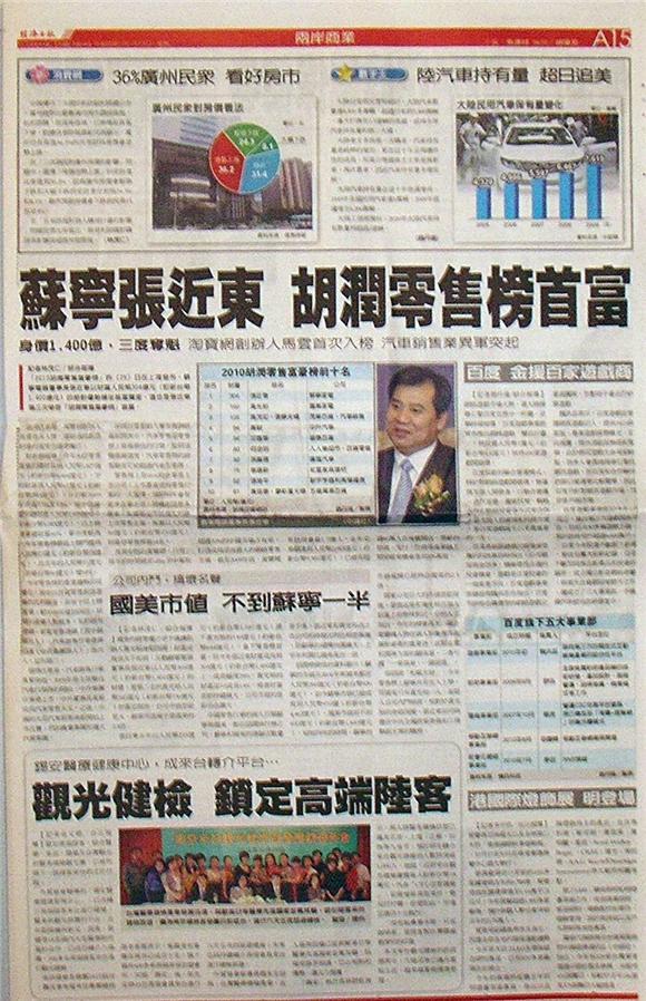 「2010胡潤零售富豪榜」昨(25)日在上海發布,蘇寧電器董事長張近東以財富人民幣304億元(約新台幣1,400億元)的絕對優勢穩坐首富寶座,這也是張近東第三次榮登「胡潤零售富豪榜」首富。
