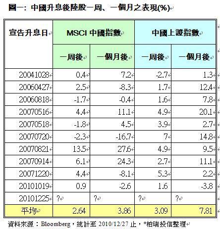 2010年東南亞各國股市搶搶滾,但中國股市表現卻敬陪末座,跌幅逾一成,而中國央行於上周六25日一如市場預期升息一碼,柏瑞中印雙霸基金經理人高子敬認為,中國市場升息主要抑制過高的物價與通膨,對股市影響有限,過去十次經驗顯示,升息後一周甚至一個月內股市多有3%至7%不等漲幅,且觀察今(27)日開盤陸股不跌反升,顯現補漲的機會即將來臨,未來一個月,陸股逢低可進場佈局。