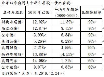 2011投資佈局跟著贏家走,新興市場債券近10年正報酬機率達90%