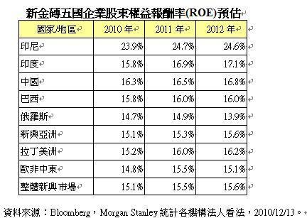 新興市場仍為明年投資焦點,根據Morgan Stanley證券統計各機構法人看法顯示,明年新興市場的企業股東權益報酬率(ROE)為15.5%,在三大新興市場區塊中,拉丁美洲明、後兩年以逾16%的幅度領先,其次為新興亞洲和歐非中東,而市場最夯的金磚五國,印尼及印度則分居第一、二名,表現最為突出。