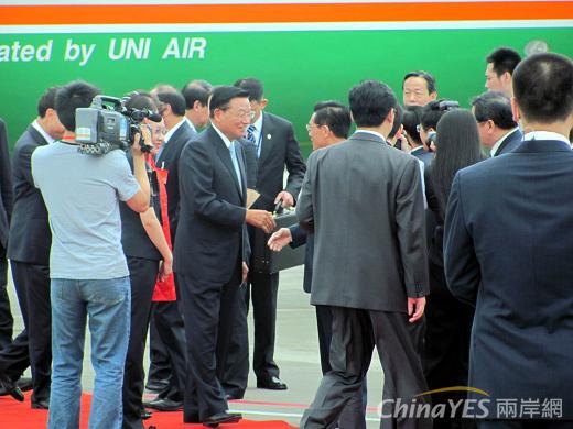 大陸海協會長陳雲林在重慶江北機場迎接海基會董事長江丙坤,並在致詞時表示,兩會工作得到越來越多的支持和理解,証明兩岸中國人完全有智慧和能力共同透過協商解決我們自己的問題。(記者劉曉霞攝)