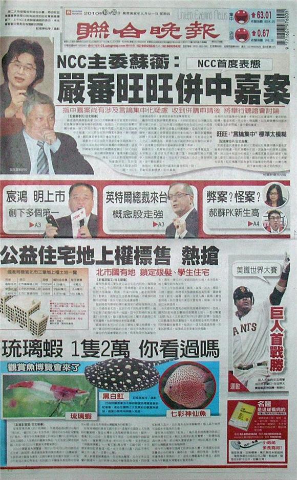 台灣主要晚報標題一覽 (10月28日)