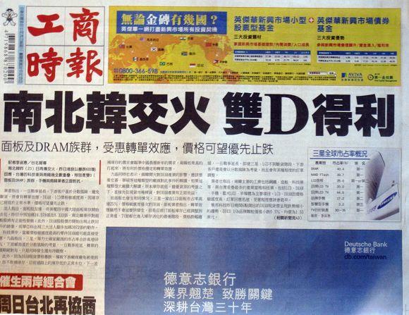 南北韓昨(23)日再傳交火,昨日港股以暴跌600點回應,台灣的科技業與南韓幾全數重疊,特別是雙D(面板及DRAM)族群、手機與南韓業者正面對抗。