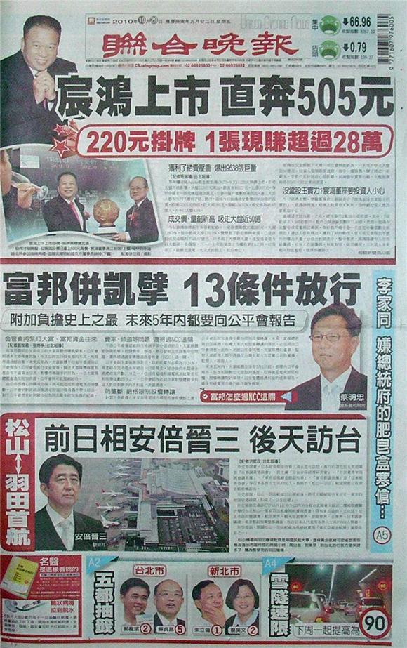 台灣主要晚報標題一覽 (10月29日)