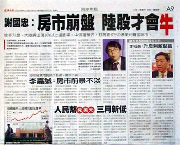 大陸獨立經濟學家謝國忠語出驚人表示,只有房市崩盤才能讓陸股重現牛市,這樣才能迫使投資人把資金撤出房市轉進股市。