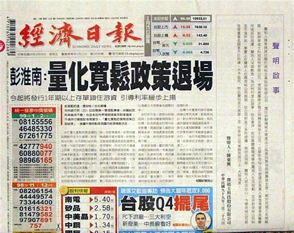 ◆自由時報:央行不升息 持續收縮市場資金
