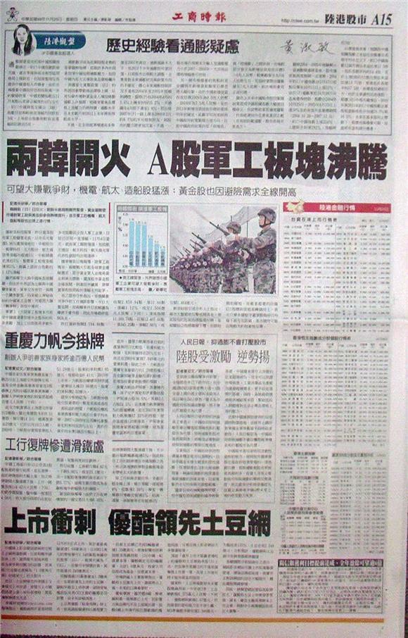 兩韓前(23)日交火,朝鮮半島局勢驟然緊張,資金避險使市場對軍工股與黃金股參與熱情提升,涉及軍工的機電、航太、造船等股也出現上漲行情。